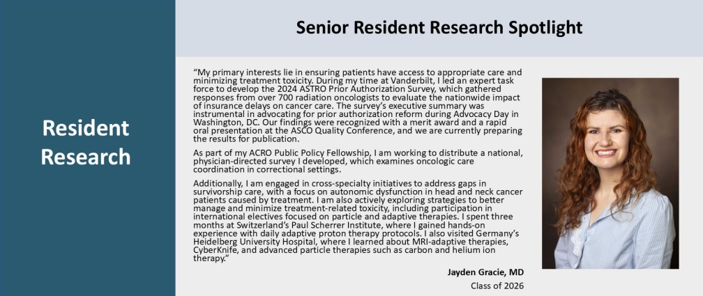 We have a significant history of residents who completed the selective ABR Holman Research Pathway, which includes 18 months of dedicated research time. Recent alumni of this program from Vanderbilt since 2006 are shown below. Resulting from their participation, our residents have received prestigious awards like the ASTRO Resident Research Seed Award for $25,000, the ASTRO Annual Meeting Resident Clinical/Basic Science Research Abstract Award in radiation and cancer biology, and the RSNA Roentgen Resident Research Award.